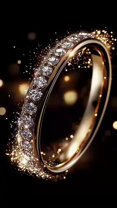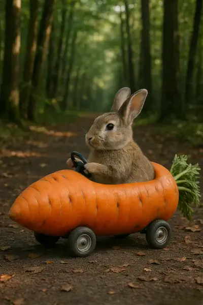 | Prompts: A sparkling diamond ring shining brilliantly against a dark background. | Prompts: A real-life rabbit driving a giant carrot car with small wheels, moving forward along a forest path. |